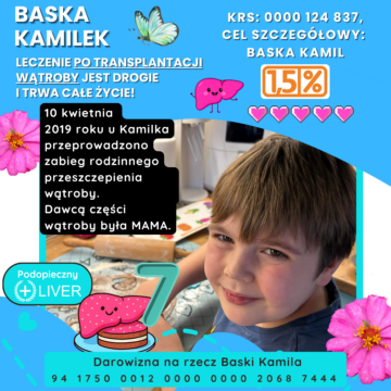 Kamilek Baska urodził się 14 kwietnia 2016 roku i od urodzenia został objęty specjalistyczną diagnostyką medyczną, która wykazała podwójnie podwyższone CRP, Aspat, GGTP, hiperbilirubinemię związaną. Podwyższone parametry stanu zapalnego, cechy cholestazy spowodowały, że Kamilek dostał antybiotyki oraz Ursofalk w płynie, Wit A, E, D3, K. Kamilek przeszedł rodzinną transplantację wątroby i po długich tygodniach pobytu w szpitalu z powodu komplikacji powrócił już do domu.