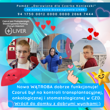 Po operacji dość często wymagał pobytów w szpitalach (w Warszawie i w Gdańsku) z powodu różnych zakażeń, infekcji oraz kontroli okresowych. Wiąże się to wszystko z dużymi wydatkami na lekarstwa, dojazdy do szpitali i pobyt w przyszpitalnym hotelu. To wszystko sprawia, że leczenie Czarka jest bardzo trudne finansowo dla naszej rodziny. Okazało się, że syn ma wadę wzroku i musi nosić okularki. Jest bardzo zadowolony, widzi różnicę w jakości widzenia. 13 października 2025 roku Czarek był na kontroli transplantacyjnej, onkologicznej i stomatologicznej w CZD. Wrócił z dobrymi wynikami do domku. Jednak nadal jest pod stałą kontrolą lekarzy i ma wyznaczone terminy na badania.