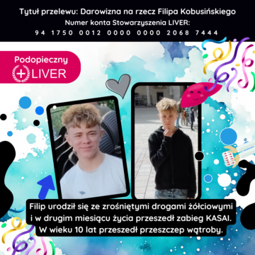 Filip urodził się 27 lutego 2009 roku z zrośniętymi drogami żółciowymi i w drugim miesiącu życia przeszedł zabieg KASAI. W wieku 10 lat przeszedł przeszczep wątroby. Aktualnie co trzy miesiące jeździ z Wrocławia do Warszawy do Centrum Zdrowia Dziecka na kontrolę. Codziennie przyjmuje leki przeciwodrzutowe, dodatkowo jest leczony hormonem wzrostu.