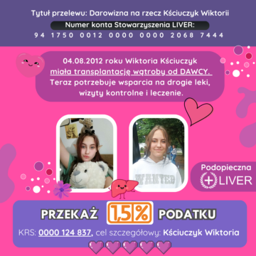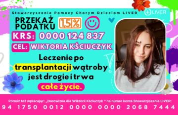 „Około 5 tyg. życia naszego Skarba wylądowałyśmy w Szpitalu w Bielsku Białej ponieważ zwymiotowała 2 razy. Tam okazało się, że ma silną anemie, brak krzepliwości krwi, podejrzenie sepsy i szereg innych przerażających diagnoz, na co nic nie wskazywało. Trafiła na OIOM, gdzie ratowano jej maleńkie życie przez 3 dni. Bogu dzięki przeżyła. Na oddziale Niemowlęcym była na obserwacji 2 tygodnie, ze względu na cholestazę i złe wyniki krwi. Po tym czasie Szpital przekazał Wiktorię Centrum Zdrowia Dziecka w Warszawie gdyż nie wiedziano jak Jej pomóc. Diagnoza – atrezja dróg żółciowych tj. zarośnięcie dróg żółciowych i natychmiastowa ( ratująca kolejny raz życie) operacja Kasai, która nie wyleczyła Wiktunii tylko wydłużyła czas na przeżycie do przeszczepienia wątroby, która ze względu na brak możliwości odpływu żółci – niszczyła ją i doprowadziła do marskości. Po 2 kontrolnej wizycie w poradni CZD okazało się, że wyniki się drastycznie pogorszyły i trafiłyśmy na oddział Gastroenterologii i Immunologii, gdzie spędziłyśmy dłuuuuugie tygodnie, które przynosiły coraz to gorsze wyniki. Wiktoria była podtrzymywana na lekach, traciła na wadze, wątroba nie była wydolna, pojawiło się wodobrzusze, żylaki przełyku, zaburzenia krzepliwości krwi. My rodzice nie mogliśmy być dawcami ponieważ nasze wątroby były zbyt duże w stosunku do ciała naszej Malutkiej. Lekarze mówili jedynie by czekać na dawce …. 🙁