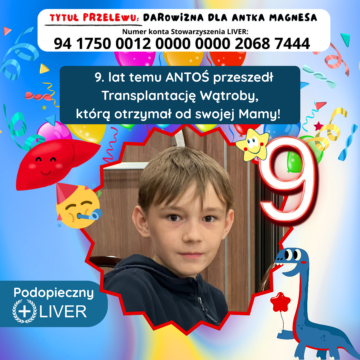 Jesteśmy Rodzicami Antosia, urodzonego 23.10.2015 r. Po trzech miesiącach tułaczki po szpitalach oraz wielu badaniach i konsultacjach usłyszeliśmy diagnozę – atrezja dróg żółciowych 21.01.2016 r. nasz synek przeszedł operację Kasai w CZD w Warszawie. Niemal pewny był przeszczep wątroby, który nastąpił 04.10.2016 roku w Warszawie. Zwracamy się z prośbą o pomoc finansową ponieważ brakuje nam pieniędzy. Przeszczep wątroby to walka o życie do końca swoich dni. To też przymus brania bardzo drogich leków, które minimalizują odrzut wątroby przez organizm. To również częste wizyty kontrolne w szpitalu poza miejscem zamieszkania. Wszystko to składa się na ogromne comiesięczne koszty.