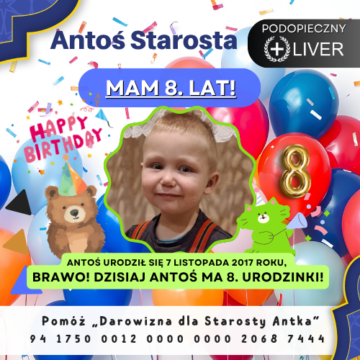 Antoś urodził się 7 listopada 2017 roku z rzadką, wielonarządową chorobą genetyczną – Zespołem Alagille’a. Postępująca choroba doprowadziła do martwicy wątroby, dlatego należało przeprowadzić transplantację. Przeszczep wątroby miał miejsce 13 kwietnia 2021 roku i po raz pierwszy w Polsce zastosowano wówczas jednocześnie krążenie pozaustrojowe oraz ECMO (pozaustrojowy układ zawierający pompę oraz oksygenator, pozwalający zastąpić przez pewien czas pracę płuc i/lub serca). Takich operacji na świecie u dzieci wykonano zaledwie kilka, dlatego cieszymy się, że Antek miał możliwość być operowany przez zespół chirurgów, anestezjologów, kardiochirurgów oraz perfuzjonistów jednych z najlepszych w swej dziedzinie.