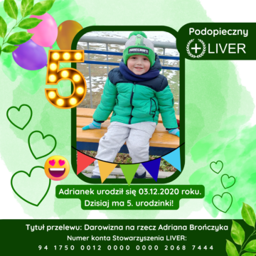 Adrian jest już po przeszczepie wątroby, który odbył się 29.06.2021 roku, dawcą organu była mama. Od tego momentu przebywał w szpitalu ciągiem do 5.10.2021 r. Niestety nie obyło się bez powikłań, ponieważ 13.07.2021 r. doszło do perforacji jelita, co kolejny raz zagrażało jego życiu. 17.09.2021 r. lekarze musieli poszerzyć żyłę wrotną, która była mocno zwężona. Z powodu niewydolności oddechowej wynikającej z dużej wątroby, lekarze postanowili założyć Mu rurkę tracheostomijną, którą miał bardzo długo ponieważ , ponieważ Adrianek nie radził sobie z samodzielnym oddychaniem.
