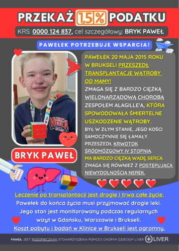 Rodzice Pawełka byli zrozpaczeni i nie mogli patrzeć i czekać na śmierć ich ukochanego synka. Dlatego zaczęli szukać jakiejkolwiek drogi by pomóc Pawełkowi. Być może jeszcze nie wszystko stracone, może diagnoza w innym ośrodku dałaby szansę na życie dla chłopca. Dlatego poprzez Stowarzyszenie LIVER Pawełek Bryk trafił na konsultację do kliniki w Brukseli. Koszty finansowe są bardzo duże ale znalazła się grupa osób, darczyńcy, którzy postanowili pomóc dziecku.