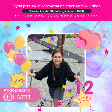 W tym samym czasie Kamila w CZD została przewieziona na Intensywną Terapię, gdzie została zaintubowana i znajdowała się w stanie narkozy czekając na organ, który trzeba było przewieźć z innego szpitala, w którym leżałam. I tak 6 lipca 2022 r. o 10:00 został pobrany 2, 3 i 4 segment mojej wątroby. Przeszczep trwał od 12:00 do 22:00 i wszystko przebiegło bez komplikacji. Kamila przez kilka dni przebywała na Intensywnej Terapii, a potem przewieziono ją na Oddział Potransplantologii Wątroby. Cały ten czas był przy niej tata, który się nią opiekował, czuwał na nią. Czuła się dobrze. Mijały dni i Kamila dochodziła do siebie, wyniki były dobre, ale skarżyła się na ból brzucha. Po tygodniu okazało się, że ma krwiaka o dużej wielkości i musiał on zostać usunięty. Operacja musiała trwać 2 godziny. Po drodze okazało się, że był wyciek żółci, trzeba było założyć dren i operacja przeciągnęła się do 4 godzin. Nie zszyto brzucha, gdyż wątroba była powiększona, włączono leczenie sterydami i lekiem przeciw odrzutowi organu. Po kilku dniach leki zaczęły działać, wątroba wróciła do normalnej wielkości. Zszyto brzuch.