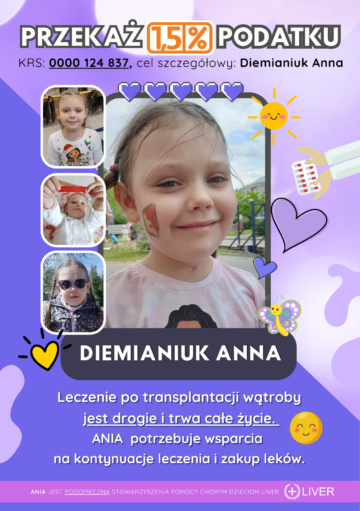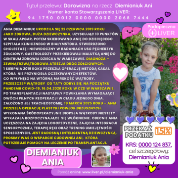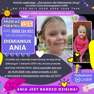 Ania Diemianiuk urodziła się 22 czerwca 2019 roku jako zdrowa, duża dziewczynka, uzyskując 10 punktów w skali Apgar. W pierwszym tygodniu życia, po opuszczeniu szpitala, wszystko wydawało się być dobrze. Niepokój mamy wzbudzał jedynie brak apetytu i ospałość córeczki. W związku z tym skierowano Anię do Dziecięcego Szpitala Klinicznego w Białymstoku. Po przeprowadzeniu badań stwierdzono cholestazę. Dodatkowy niepokój lekarzy wzbudzał niewidoczny w badaniach USG pęcherzyk żółciowy. Gastrolodzy przekierowali malutką Anię do Centrum Zdrowia Dziecka w Warszawie. Diagnoza nie była pomyślna – zewnątrzwątrobowa atrezja dróg żółciowych. 1 sierpnia 2019 roku Anusia przeszła operację metodą Kasai, co miało usprawnić odpływ żółci z wątroby. Po kilkutygodniowej hospitalizacji mała pacjentka wróciła do domu. Niestety, w perspektywie okazało się, że operacja nie przyniosła oczekiwanych efektów, co wpłynęło na wtórną marskość wątroby. Oznaczało to, że u Ani konieczny stał się przeszczep narządu jeszcze w pierwszym roku jej życia.