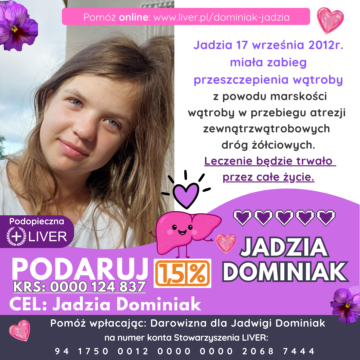 Jadzia Dominiak urodziła się 27.11.2010 roku z wrodzoną wadą atrezją dróg żółciowych. W 11 tygodniu życia przeszła operację hepatoportoenterastomię metodą Kasai w CZD w Warszawie. Od tamtej pory jest pod stałą opieką tamtejszych lekarzy. Niestety ta operacja nie wystarczyła, choroba postępowała i doprowadziła do marskości wątroby.