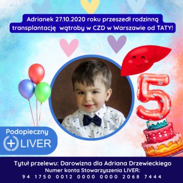 Adrian Drzewiecki urodził się 9 kwietnia 2020 roku. W wieku 3 miesięcy przedłużająca się żółtaczka i wysoki poziom bilirubiny zaniepokoił rodziców i lekarzy. W CZD w Warszawie zdiagnozowano atrezję dróg żółciowych zewnątrzwątrobowych z wtórną marskością wątroby i cholestazą.