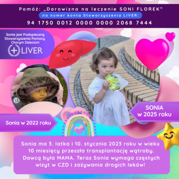 I tak 10 stycznia 2023 roku w wieku 10 miesięcy córeczka przeszła transplantację wątroby. Dawcą byłam ja mama. Sonia wyniki ma stabilne, w sierpniu 2023 roku przeszła angioplastykę krytycznie zwężonej żyły wrotnej, krwawienia do przewodu pokarmowego, zakażenie EBV, CMV, podejrzenie PTLD, które zostałowy kluczone. Sonia w październiku 2024 roku miała biopsję wątroby. W styczniu 2025 roku czeka ją kolejna kontrola.
