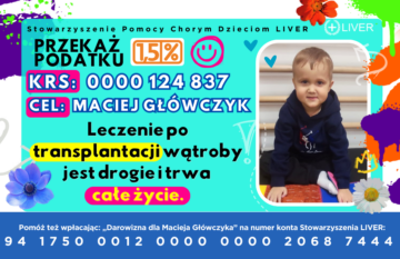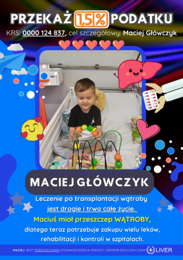 Główczyk Maciej urodził się 20.04.2020 roku z atrezją dróg żółciowych. Maciuś ma zdrową siostrę bliźniaczkę oraz starszą siostrę, urodził się ” niby ” zdrowy otrzymał 10 punktów w skali Apgar. Po 7 dniach od porodu został wypisany do domu, po miesiącu pojechał na kontrolę do Opola, czujną Panią doktor zaniepokoił kolor skóry Maćka, zleciła badania. Na drugi dzień otrzymaliśmy telefon, że mamy pilnie zgłosić się do szpitala. W szpitalu w Opolu spędził 5 dni, po czym został przetransportowany do IPCZD. Maciuś w czerwcu 2020 roku przeszedł operację Kasai, w okresie pooperacyjnym przeszedł wirusa cytomegalii oraz posocznicę. Po prawie 3 miesiącach pobytu w szpitalu został wypisany do domu. Przez rok po operacji jeździł do poradni do Warszawy. W listopadzie 2021, ze względu na małopłytkowość otrzymał skierowanie do szpitala na pierwszą gastroskopię. Stwierdzono u Macieja żylaki przełyku. Maciej do tej pory miał 3 razy opaskowane żylaki. Maciej boryka się także z splenomegalią, ciśnieniem wrotnym oraz autyzmem (Maciej nie mówi). Od kwietnia 2024r. uczęszcza do przedszkola terapeutycznego. W lipcu w roku 2024 w trakcie hospitalizacji stwierdzono podwyższone stężenie amoniaku. Maciej od lipca zażywa xifaxan.