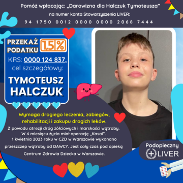 Tymoteusz Halczuk urodził się 28.04.2010 w Białej Podlaskiej. Po około 3 miesiącach została zdiagnozowana atrezja dróg żółciowych i marskość wątroby. W 4 miesiącu życia wykonano operację „Kasai”. 1 kwietnia 2023 roku w CZD w Warszawie wykonano przeszczep wątroby od DAWCY. Po przeszczepie pojawiły się powikłania „torbiel wewnątrzwątrobowa” i później został zrobiony drenaż zewnętrzny żółci. Od tego czasu Tymek bardzo często jeździ do CZD w Warszawie. Ciągle ufamy, że przyjdzie jeszcze dobry czas. Ufamy, że Bóg ma najlepszy plan i tego oczekujemy.