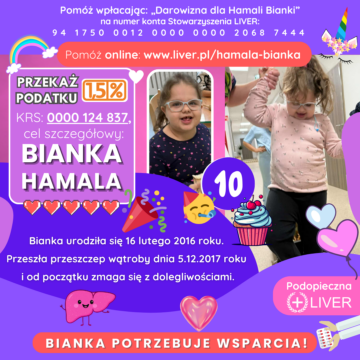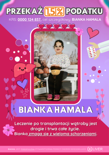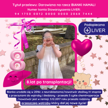 Bianka urodziła się w 2016 roku z neuroblastoma/nowotwór złośliwy IV stopnia z przerzutami do wątroby i śledziony – przeszła 3 cykle chemii+operacje /nowotwór jest w remisji. W 2017 roku przeszła rodzinny przeszczep wątroby, który dał jej nowe życie ![]()