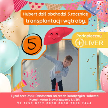 Hubert Rubajczyk urodził się 13.02.2018 r. W wieku 1,5 roku zdiagnozowano u niego HEPATOBLASTOMĘ, czyli złośliwy nowotwór wątroby. Niestety choroba postępowała. Chcąc ratować życie Huberta, lekarze postanowili, że konieczny jest przeszczep wątroby. 17.11.2020 r. przeprowadzono transplantację wątroby. Dawcą była mama. Po operacji pojawił się ostry odrzut wątroby, ale lekarzom udało się opanować sytuację.