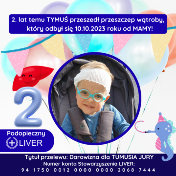 Po miesięcznej diagnostyce, poszukiwaniu przyczyny nieustępującej cholestazy, podejrzeniu atrezji dróg żółciowych zakwalifikowano mnie do przeszczepu wątroby, który odbył się 10.10.2023. Swoją wątrobą podzieliła się ze mną MAMA 🙂