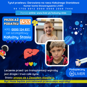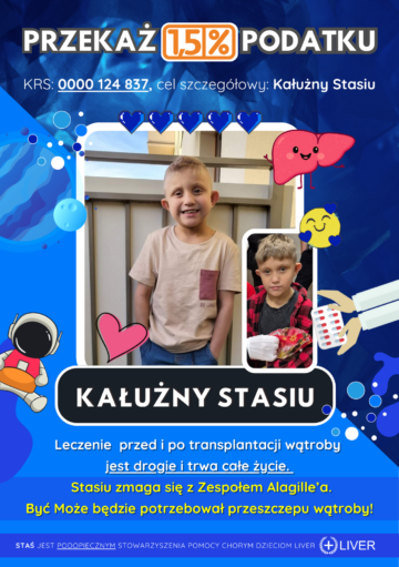 Kałużny Stasiu ma 8 lata i od urodzenia zmaga się z Zespołem Alagille’a. Z tego powodu ma problemy z nerkami, cholestazę, zwężenie cieśni aorty. Cierpi także z powodu niedosłuchu, zaćmy na oczku, zwężenia cieśni aorty, wzmożonego napięcia mięśniowego, problem z wątrobą daję się także we znaki w postaci uporczywego świądu i ciągłe zmiany dermatologiczne. Dodatkowo doszły problemy z nerkami, które wykazują torbielowatość.