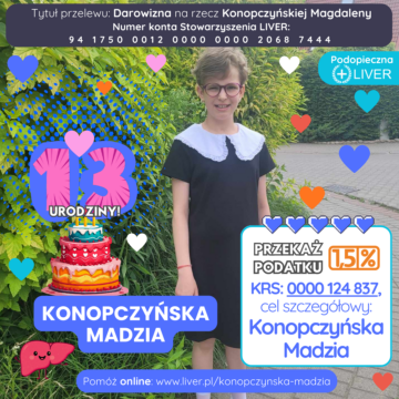 Konopczyńska Madzia urodziła się 16 marca 2013 roku, po miesiącu miała wykonaną operację Kasai, która niestety nie przyniosła poprawy zdrowia, w okresie pooperacyjnym przebyła zapalenie dróg żółciowych i pojawiły się cechy marskości wątroby. W październiku Magda została wpisana na listę osób oczekujących na przeszczepienie organu. Na początku tego roku stan zdrowia dziewczynki znacznie się pogorszył i została przyjęta do Centrum Zdrowia Dziecka z powodu gorączki, żółtaczki, niedożywienia oraz wszystkich poziomów bilirubiny oraz enzymów wątrobowych. Pojawiło się wodobrzusze, żylaki oraz cechy dekompensacji wątroby.