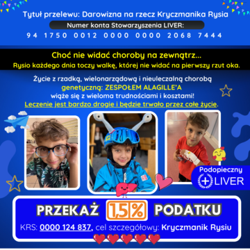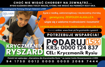 Rysio nadal: zmaga się z postępującym uszkodzeniem wątroby, zmaga się z wadą serca, rozszczepem kręgów, przyjmuje codziennie leki i witaminy, które nie są refundowane, wymaga stałej opieki specjalistów i częstych kontroli. Choroba nie tylko odebrała mu zdrowie, ale i szansę na normalny rozwój. Pojawił się nowy, trudny problem. Rysio bardzo słabo rośnie. Jest znacznie mniejszy od swoich rówieśników. Niestety z powodu choroby podstawowej nie ma możliwości leczenia tego zaburzenia. Wiemy już, że zawsze będzie odstawał – nie tylko wzrostem, ale i zdrowiem. Pomóż nam zabezpieczyć przyszłość Rysia! Każdy dzień to walka o komfort życia naszego synka. Każda pomoc daje nam siłę i możliwości, by dalej walczyć o jak najlepsze życie dla Rysia. Dlatego z całego serca prosimy o przekazanie 1,5 % podatku lub wsparcie finansowe”.
