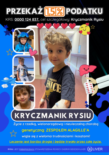 Rysio nadal: zmaga się z postępującym uszkodzeniem wątroby, zmaga się z wadą serca, rozszczepem kręgów, przyjmuje codziennie leki i witaminy, które nie są refundowane, wymaga stałej opieki specjalistów i częstych kontroli. Choroba nie tylko odebrała mu zdrowie, ale i szansę na normalny rozwój. Pojawił się nowy, trudny problem. Rysio bardzo słabo rośnie. Jest znacznie mniejszy od swoich rówieśników. Niestety z powodu choroby podstawowej nie ma możliwości leczenia tego zaburzenia. Wiemy już, że zawsze będzie odstawał – nie tylko wzrostem, ale i zdrowiem. Pomóż nam zabezpieczyć przyszłość Rysia! Każdy dzień to walka o komfort życia naszego synka. Każda pomoc daje nam siłę i możliwości, by dalej walczyć o jak najlepsze życie dla Rysia. Dlatego z całego serca prosimy o przekazanie 1,5 % podatku lub wsparcie finansowe”.