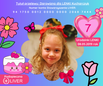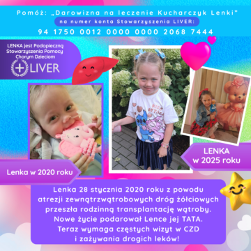 „Lenka od września zaczęła przygodę z zerówka. W przedszkolu, aktywnie bierze udział w zajęciach, poznaje literki, cyferki. Uczęszcza, również na zajęcia dodatkowe po przedszkolu z języka Angielskiego, oraz języka Hiszpańskiego – jest bardzo zadowolona z tych zajęć i Panie ją bardzo chwalą. Nie zabraknie również, częstych infekcji, przeziębień, zapaleń płuc czy oskrzeli. Ale szybko z nimi walczymy, aby wróci do przedszkola. Oczywiście jeździmy na kontrolę do Centrum zdrowia dziecka. W listopadzie mamy kontrolę w poradni chorób wątroby, potem dentysta, kardiolog itp. Na tą chwilę Lenka swoje wyniki ma bardzo dobre. Jesteśmy z niej bardzo dumni, że pomimo tak wielu problemów jest w tak bardzo dobrym stanie, i świetnie daje sobie radę w życiu”.