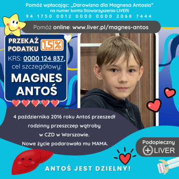 Jesteśmy Rodzicami Antosia, urodzonego 23.10.2015 r. Po trzech miesiącach tułaczki po szpitalach oraz wielu badaniach i konsultacjach usłyszeliśmy diagnozę – atrezja dróg żółciowych 21.01.2016 r. nasz synek przeszedł operację Kasai w CZD w Warszawie. Niemal pewny był przeszczep wątroby, który nastąpił 04.10.2016 roku w Warszawie. Zwracamy się z prośbą o pomoc finansową ponieważ musimy zapewnić Antosiowi najlepsze leczenie i kosztowne leki. Przeszczep wątroby to walka o życie do końca swoich dni. To też przymus brania bardzo drogich leków, które minimalizują odrzut wątroby przez organizm. To również częste wizyty kontrolne w szpitalu poza miejscem zamieszkania. Wszystko to składa się na ogromne comiesięczne koszty.