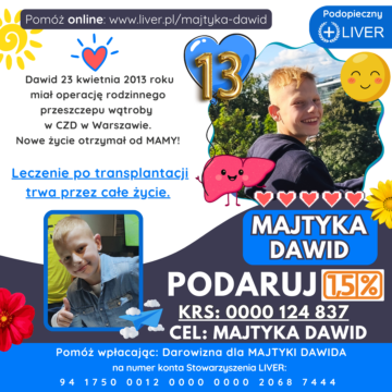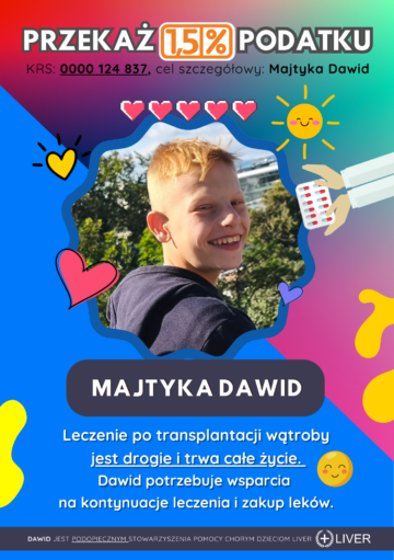 Dawid Majtyka urodził się 5 listopada 2012 roku w Śląskim Szpitalu Uniwersyteckim w Wodzisławiu Śląskim. Od początku walczył o życie ponieważ miał niedotlenienie a w 3 dobie wystąpiły problemy z zaleganiem treści w żołądku. Okazało się, że Dawidek miał niedrożny przewód pokarmowy na poziomie dwunastnicy. Lekarze wykonali u naszego synka w pierwszych dniach życia zabieg chirurgiczny, w którym stwierdzili, że ma przepuszczającą przegrodę dwunastnicy oraz brak pęcherzyka żółciowego. Podczas tego zabiegu doszło do zakażenia gronkowcem, został poddany antybiotykoterapii, a z powodu niedokrwistości i małopłytkowości konieczna była transfuzja krwi. Podczas wielu badań dowiedzieliśmy się, że Dawidek ma cechy narastającej cholestazy i niedrożność zewnątrzwątrobowych dróg żółciowych. Od tego momentu zostaliśmy przeniesieni w celu kontynuacji leczenia do Centrum Zdrowia Dziecka.