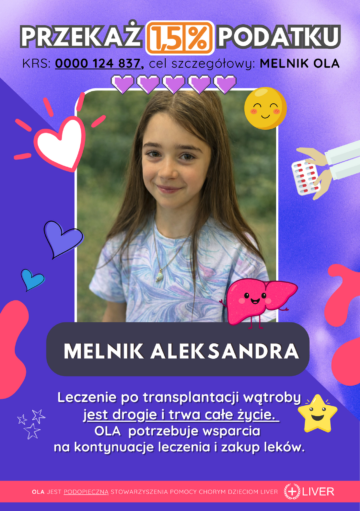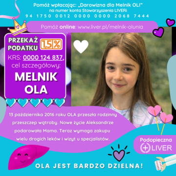 Oleńka jest wspaniałą i bardzo energiczną dziewczynką. Na szczęście rozwija się dobrze i nie odbiega niczym od swoich rówieśników, mimo tego jak wiele przeszła. Obecnie Ola jest w 3 klasie i świetnie sobie radzi w szkole, ma wiele koleżanek i wspaniałe Panie. Ola jest pod kontrolą wielu specjalistów, jak również endokrynologa w CZD z powodu wolniejszego wzrostu. W październiku 2024 r. czekają Olę kolejne badania, oraz pobyt w szpitalu z powodu biopsji wątroby.