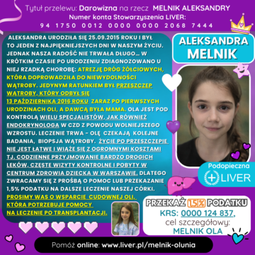 Aleksandra urodziła się 25.09.2015 roku i był to jeden z najpiękniejszych dni w naszym życiu. Jednak nasza radość nie trwała długo… W krótkim czasie po urodzeniu zdiagnozowano u niej rzadką chorobę, która doprowadziła do niewydolności wątroby. Jedynym ratunkiem był przeszczep wątroby, który odbył się zaraz po pierwszych urodzinach Oli, a dawcą była MAMA.