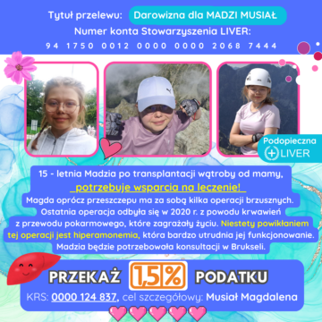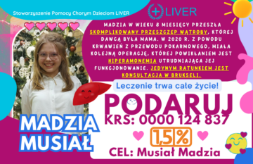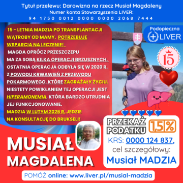 Madzia będzie potrzebowała konsultacji w Brukseli. Mimo, że od przeszczepu minęło ponad 14 lat, Magda w dalszym ciągu boryka się z problemami zdrowotnymi, np. Autoimmunologicznym zapaleniem wątroby, hiperamonemią, nadciśnieniem wrotnym, somatotropinową niedoczynnością przysadki (obecnie leczenie hormonem wzrostu), zespołem WPW z powody wady serca. Madzia wymaga stałej, specjalistycznej opieki i zażywania drogich leków. Leczenie jest TRUDNE I DROGIE. Potrzebuję wsparcia na leki i dojazdy do szpitali. Wesprzyj Madzię i podaruj 1,5 % podatku oraz darowizny.