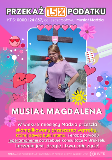 Madzia urodziła się 08.02. 2011 r. z wrodzoną niedrożnością dróg żółciowych. Wada ta doprowadziła do marskości wątroby. W wieku 8 miesięcy Madzia przeszła skomplikowany przeszczep wątroby, której dawcą była mama. Nie obyło się bez licznych poważnych powikłań, gdzie potrzebne były kolejne operacje. Magda oprócz przeszczepu ma za sobą kilka operacji brzusznych. Ostatnia operacja odbyła się w 2020 r. z powodu krwawień z przewodu pokarmowego, które zagrażały życiu. Niestety powikłaniem tej operacji jest hiperamonemia, która bardzo utrudnia jej funkcjonowanie. Jej leczenie to duże wyzwanie dla lekarzy w Polsce.