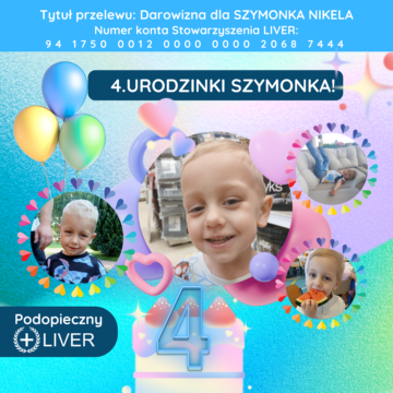 Szymon Nikel urodził się 10.09.2021 roku. Wykryto u niego wielotorbielowatość nerki i cholestazę. 19 października 2021 roku przeszedł zabieg Kasai z powodu atrezji dróg żółciowych, ale niestety z powodu marskości wątroby musiał 10 maja 2022 roku przejść transplantację wątroby. 2 tygodnie po przeszczepie przez rozwijające się wirusy i zakażenia doszło do ostrej niewydolności płuc. Szymon przez 9 dni był podłączony do ECMO. Na OIT walczył 34 dni. Na szczęście udało się go rozintubować i możemy być razem na oddziale. Teraz czekamy na wyniki tomografu bo prawdopodobnie trzeba będzie poszerzyć żyłę wrotną.