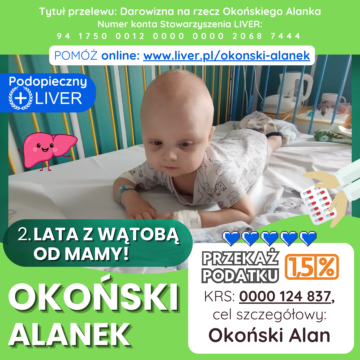 Alanek Okoński urodził się 14 stycznia 2023 roku w 32 t.c. Od razu po porodzie został przewieziony do innego szpitala z tachykardią serca gdzie przez 3 miesiące lekarze walczyli o jego życie. Początkowo synek potrzebował wsparcia respiratora dopóki lekarzom nie udało się ustabilizować jego stanu zdrowia. Po unormowaniu częstoskurczy zaczęto Alanka naświetlać lampami z powodu przedłużającej się żółtaczki. Jednak to nie dawało rezultatu i zaczęto robić szereg badań, które potwierdziły cholestazę. Został przekierowany do CZD w Warszawie gdzie potwierdzono atrezję dróg żółciowych i synek przeszedł poważna operację zwaną przez lekarzy Kasai. Początkowo wyniki były zadawalające. Jeździliśmy raz w miesiącu na kontrolę, jednak z końcem września 2024 roku wyniki zaczęły się pogarszać i podjęto decyzję o zaczęciu kwalifikacji Alanka do przeszczepu wątroby. Od tamtej pory szpital stał się naszym drugim domem, ponieważ więcej czasu spędzaliśmy tam niż w domu z drugim synem.