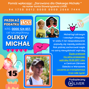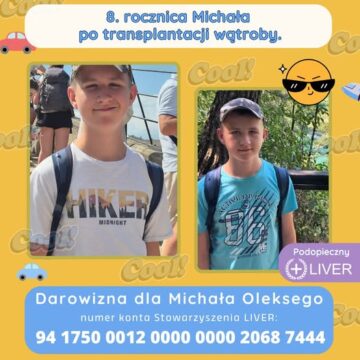 Rok później równie niespodziewanie dowiedzieliśmy się, że Michał zachorował nagle na ostrą niewydolność wątroby. Życie uratował mu 19 września 2017 roku przeszczep w Centrum Zdrowia Dziecka w Warszawie, do której musimy jeździć na wizyty kontrolne.
