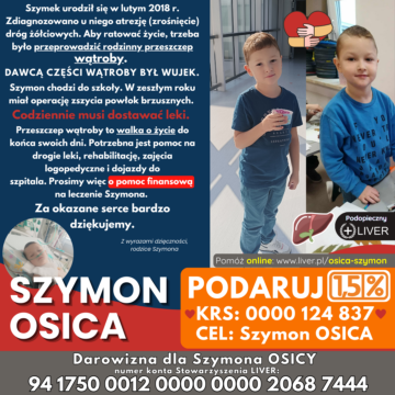 18 września 2018 r. Szymuś przeszedł skomplikowaną operację transplantacji wątroby. Szymek od września rozpoczął przygodę w „zerówce” bardzo dzielnie sobie radzi. Swój wolny czas spędza aktywnie – na graniu w piłkę i jeździe na rowerze♥️.
