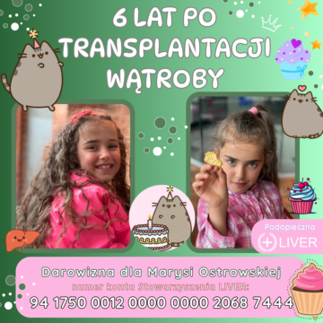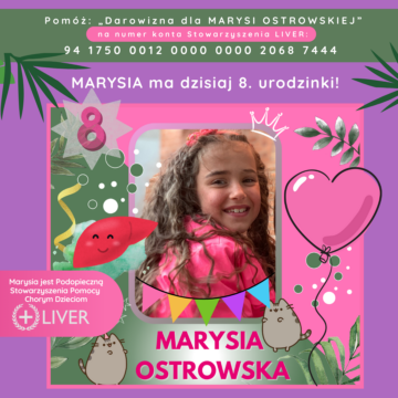 Marysia Ostrowska urodziła się zdrowa 27 listopada 2017 roku jako jedna z bliźniaczek. Przez pierwsze 22 miesiące życia rozwijała się doskonale. 23 września 2019 roku zauważyłam u niej żółte białka oczu, trafiłyśmy na Oddział Dziecięcy w Turku, aminotransferazy przekraczały 1500… Następnego dnia rano pojechałyśmy karetką do Poznania na Nowowiejskiego na oddział zakaźny. Tam z dnia na dzień stan Marysi pogarszał się. W piątek 27 września samolotem zostałyśmy przetransportowane do CZD, kolejnego wieczoru Marysia trafiła na OIT i rozpoczęły się przygotowania do przeszczepu wątroby. W nocy 29/30.09.2019 roku odbyła się operacja, po kilku dniach reoperacja dróg żółciowych. Ostra niewydolność wątroby o nieznanej do dziś etiologii zaatakowała nagle. Od pierwszych objawów do przeszczepu minęło zaledwie 6 dni. U Marysi 9 sierpnia 2022 roku odbyła się plastyka powłok brzusznych, po której na szczęście szybko wróciła do formy. Rozwija się dobrze, biega, jeździ na hulajnodze, śpiewa, rysuje, poznaje literki i cyferki…
