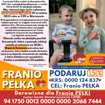 Franciszek Pełka urodził się 16 października 2021 roku. W 6 dobie życia trafił do Centrum Zdrowia Dziecka m.in. z podejrzeniem atrezji dróg żółciowych. 23.11.2021 roku przebył operację metodą Kasai. Niestety operacja nie przyniosła zamierzonych celów. W przebiegu atrezji dróg żółciowych doszło do marskości wątroby. Franio przeszedł w kwietniu kwalifikację do przeszczepu. Pod koniec maja ponownie trafił do Centrum Zdrowia Dziecka z powodu niewielkiego wodobrzusza, spadku poziomu albumin i zapalenia dróg żółciowych. Podczas hospitalizacji, ze względu na słabe przyrosty masy, zmieniono preparat do żywienia na Peptamen Junior i Fantomalt. Transplantacja wątroby miała miejsce 20 września 2022 roku w CZD w Warszawie. W drugiej dobie po transplantacji konieczna była kolejna operacja, że względu na przeciek żółci, założono dren. 25.09 zszyto jego brzuszek.
