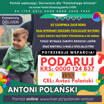 Nasz Podopieczny Antoś Polański urodził się jako wcześniak 18.11.2017 roku. Już na porodówce wykryli u niego podwyższone wskaźniki wątrobowe i w ten sposób zaczęła się dalsza diagnostyka. W kolejnym szpitalu stwierdzono u Antosia cholestazę i z taką diagnozą trafił do IP CZD w Warszawie, gdzie po dalszych badaniach potwierdziła się atrezja dróg żółciowych. W styczniu miał operację metodą Kasai. Jednak operacja nie przyniosła zamierzonego skutku, gdyż okazało się, iż Antoś nie miał zewnątrzwątrobowych dróg żółciowych. Kazano nastawić się, że za pół roku będzie potrzebny przeszczep wątroby i tak 02.08.2018 roku Antoś miał rodzinny przeszczep wątroby.
