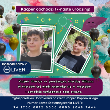 Kacper Poprawski urodził się 09.10.2008 roku. Choruje na genetyczną chorobę Wilsona, w chorobie tej miedź gromadzi się w wątrobie i powoduje uszkodzenie tego organu. Chorobę wykryto u Kacperka tak naprawdę przez przypadek. Zrobiliśmy badania kontrolne z powodu częstego krwawienia z nosa. Po 6 miesiącach i kilkukrotnych pobytach w szpitalach z powodu bardzo wysokich prób wątrobowych, wysłano krew syna do CZD w Warszawie. Po pierwszej wizycie w CZD zadecydowano o biopsji wątroby, po której zakwalifikowano syna do leczenia Zincteralem. Próby wątrobowe zaczęły spadać, jednak po roku lek ten wywołał zapalenie błony śluzowej żołądka, objawiające się częstymi bólami brzucha. Jest lek, który Kacperek może zażywać. To lek Wilzin niestety nie jest refundowany w naszym kraju.
