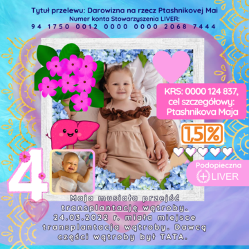 Maja urodziła się 16 lipca 2021 roku z wrodzoną niedrożnością dróg żółciowych. Mając cztery tygodnie córeczka miała wykonaną operację metodą KASAI. Mimo przeprowadzonej operacji nastąpił dalszy rozwój cholestazy, który ma wpływ na wyniszczenie wątroby. W konsekwencji doszło do marskości wątroby, dlatego Maja musiała przejść transplantację wątroby. Dokładnie 24.03.2022 r. miała miejsce transplantacja wątroby. Dawcą części wątroby był TATA.