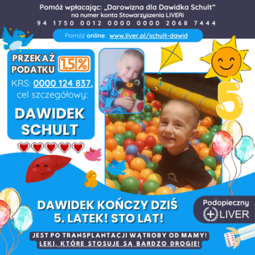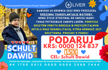 Dawid urodził się 10 marca 2021 roku jako zdrowy chłopczyk. Jednak kiedy miał 22 miesiące trafił z ostrą niewydolnością wątroby do CZD w Warszawie. Przyczyna nagłej choroby nie została wykryta jednak lekarze podejrzewali cytopalię mitrochondrialną. Nie było innego wyjścia by ratować życie Dawidka musiał być przyjęty w trybie pilnym, by 20 grudnia 2022 roku przejść transplantację wątroby od mamy. Na całe szczęście okres pooperacyjny Dawidek zniósł bez powikłań chirurgicznych. Od czwartej doby po operacji z powodu małopłytkowości lekarze odstawili MMF, który ponownie włączono w 3 tygodniu stopniowo redukując sterydy.