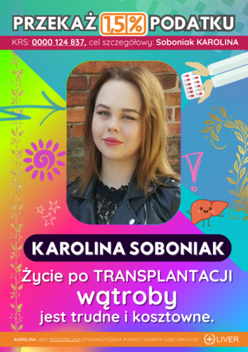 Dlatego zwracam się do Stowarzyszenia LIVER o pomoc w walce z chorobą Karoliny. Jesteśmy w trudnej sytuacji życiowej i materialnej. Leczenie córki pochłania mnóstwo pieniędzy, energii i nerwów. Potrzebujemy wsparcia ludzi o złotych sercach i bardzo będziemy wdzięczni za jakąkolwiek pomoc. Na rzecz Karolinki można przekazać 1,5 % podatku oraz darowiznę.