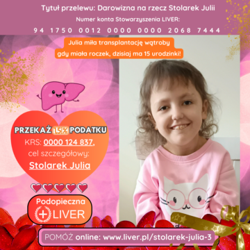Julia ma także opóźnienie rozwoju psycho-ruchowego, jedyną szansą na rozwój jest rehabilitacja. Zajęcia rehabilitacyjne są bardzo kosztowne, dlatego zwracamy się do Państwa z prośbą o pomoc. Julia codziennie musi zażywać leki immunosupresyjne minimalizujące odrzut przeszczepionego organu, leki wspomagające jej odporność. Bardzo częste wyjazdy do szpitali na badania kontrolne, zajęcia rehabilitacyjne za, które trzeba płacić powodują bardzo wysokie koszty. Można wspomóc leczenie JULKI STOLAREK przekazując na jej rzecz 1,5% PODATKU.