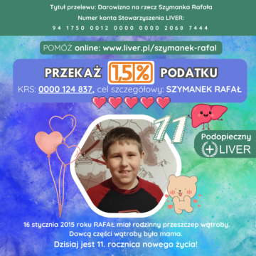 Rafałek pozostaje pod stałą opieką CZD w Warszawie. Wymaga ciągłej kontroli przez poradnię transplantacyjną, kardiologiczną, nefrologiczną oraz alergologii. Środki zebrane z 1,5% podatku pomagają w finansowaniu leków oraz rehabilitacji Rafałka. Niestety ze względu na stan zdrowia i powracające infekcję nie uczestniczy on w zajęciach szkolnych i jego nauczanie prowadzone jest indywidualnie.