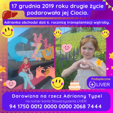 która 17 grudnia 2019 roku przeszła rodzinną transplantacje wątroby w CZD w Warszawie. Nowe życie podarowała Adriannie jej Ciocia.