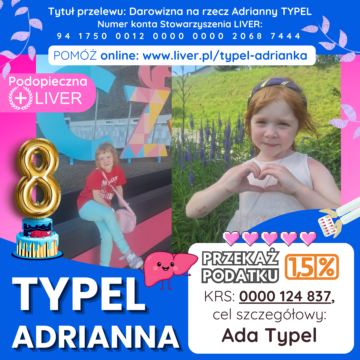 Typel Adrianna przyszła na świat 5.02.2018 roku i jest dzielną, uśmiechniętą dziewczynką, która urodziła się z rzadką wadą wrodzoną, jaką jest atrezja dróg żółciowych. Pierwsze objawy choroby pojawiły się już w 4 dniu życia Ady, w związku z czym początek życia spędziła w szpitalach. Po miesiącu życia 7 marca 2018 roku przeszła operację metodą Kasai, która przedłużyła jej życie. Pierwszy raz Adusia przybyła do domu mając 2.5 miesiąca.