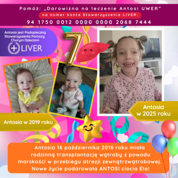 Z powodu problemów z oddychaniem konieczne było założenie tracheostomii. Bardzo długo przebywała w szpitalu CZD w Warszawie z powodu komplikacji po przeszczepie. Antosia stale potrzebuje środków na zakup leków, specjalistycznych odżywek, na częste wizyty kontrolne w szpitalach IP CZD w Warszawie oraz Prokocimiu w Krakowie, pokrycie kosztów dojazdu oraz pobytu rodziców w przyszpitalnym hotelu. Konieczna jest również rehabilitacja, zajęcia z logopedą oraz wspomaganiem w rozwoju małej Antosi.
