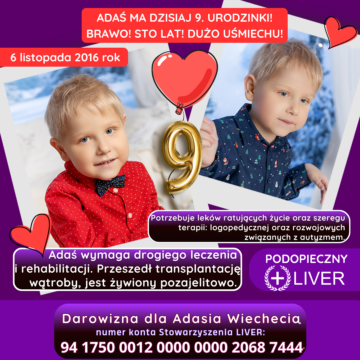 Przeszczep wątroby to walka o życie do końca swoich dni. To też przymus brania, niestety, bardzo drogich leków, które minimalizują odrzut wątroby przez organizm. To także częste wizyty kontrolne poza miejscem zamieszkania. Wszystko to składa się na ogromne comiesięczne koszty, które mocno nadwyrężają budżet całej rodziny. Prosimy zatem o pomoc finansową na leczenie, rehabilitację oraz na sprzęt medyczny specjalistyczny dla Adasia. Każdy grosz będzie cennym podarunkiem dla niego.