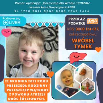 Tymoteusz urodził się w maju 2021 roku. Już w pierwszych dniach życia okazało się, że jego wątroba nie funkcjonuje prawidłowo. W wieku 3 miesięcy przeszedł operację Kasai, a mimo to stan Tymka pogarszał się. Dodatkowo pojawił się zespól Hornera. Z tej przyczyny Tymek musiał zostać poddany następnej operacji.