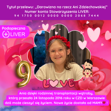 Proszę dobrych ludzi o pomoc i wsparcie dla mnie, które zostanie przeznaczone na leczenie, leki i rehabilitację po to abym mogła cieszyć się życiem. Mogą być to wpłaty indywidualne jak i przekazanie 1,5% należnego podatku. Jestem podopieczną Stowarzyszenia Pomocy Chorym Dzieciom LIVER.