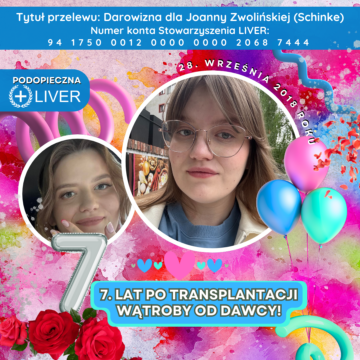 Joanna Zwolińska (Schinke) urodziła się w styczniu 2001 roku jako zdrowa i pełna energii dziewczynka. W wieku 7 lat zdiagnozowano u niej chorobę wątroby. Wszystko to stało się przypadkiem, niespodziewanie, miało początek podczas zwykłej wizyty w gabinecie stomatologicznym, kiedy zaniepokojona krwawieniem lekarka skierowała nas na badania krwi. Nazajutrz, po otrzymaniu wyników byliśmy już rodzicami ciężko chorego dziecka.