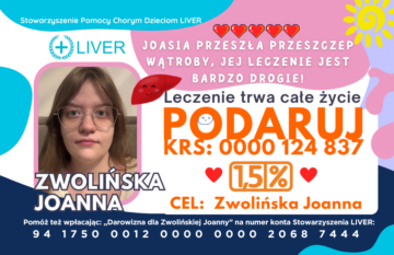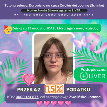 Joanna Zwolińska (Schinke) urodziła się w styczniu 2001 roku jako zdrowa i pełna energii dziewczynka. W wieku 7 lat zdiagnozowano u niej chorobę wątroby. Wszystko to stało się przypadkiem, niespodziewanie, miało początek podczas zwykłej wizyty w gabinecie stomatologicznym, kiedy zaniepokojona krwawieniem lekarka skierowała nas na badania krwi. Nazajutrz, po otrzymaniu wyników byliśmy już rodzicami ciężko chorego dziecka.